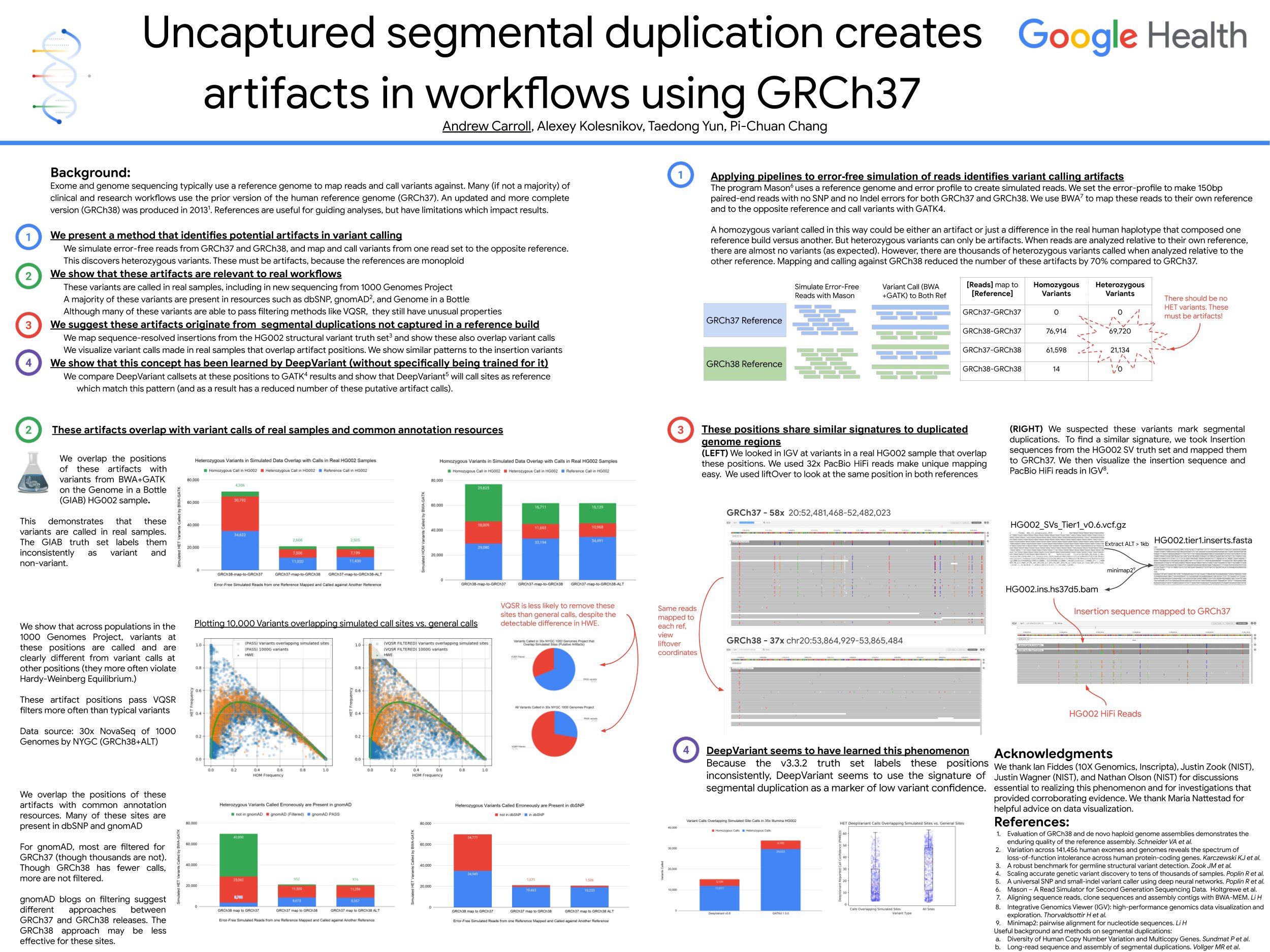 In addition, there is another pattern that causes DeepVariant to suspect variant positions which can initially seem counterintuitive to human observers. This occurs when a dense set of variants appears on one haplotype while the other haplotype is fully reference, and humans often perceive this as missing a clearly heterozygous position. DeepVariant seems to have learned that this signature often indicates a region which is a segmental duplication, copy number variant, or structural variant where multiple copies of similar genomic regions are mapping to the same reference location. In this case, it may be worthwhile to inspect the region to see if it has elevated coverage, and whether you can identify more than 2 haplotypes present by overlapping the reads. If you can, it suggests that the region may have a copy number variation. Some analysis of this was presented at AGBT as a poster “Uncaptured segmental duplication creates artifacts in workflows using GRCh37”.
